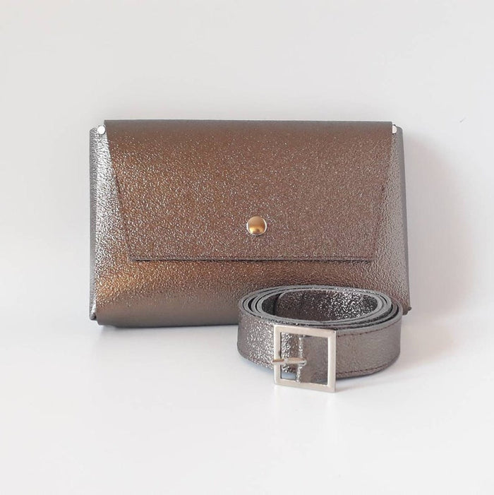 This leather waist bag is made of metallic leather. The bag has one interior pocket and snap batten closure. On the backside are two leather loops you can easily put your bag on a belt. It's perfect to hold keys, cell phones, cards or other small items. It's simple and stylish, perfect for festivals or traveling.